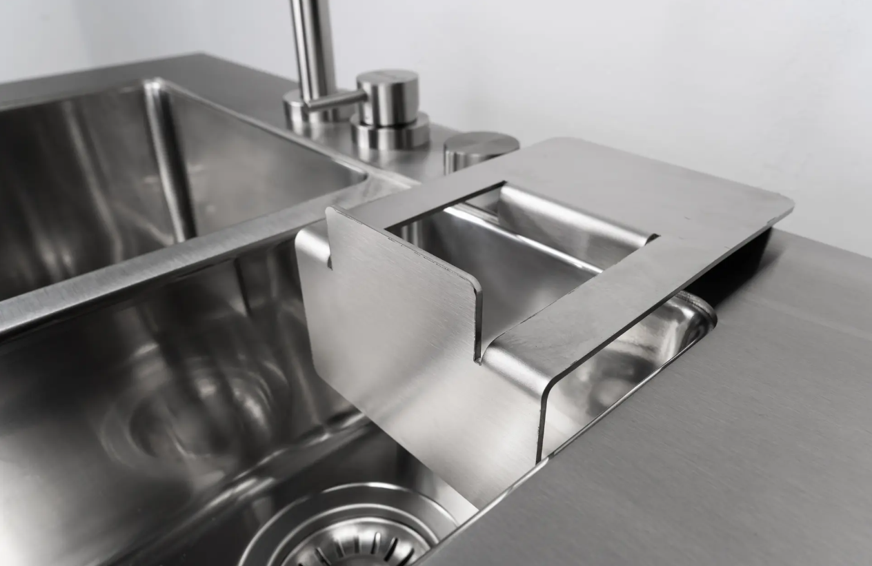 Die beiden Becken können mit passgenauen Edelstahleinlegern abgedeckt werden, um bei Bedarf zusätzliche Arbeitsfläche zu schaffen. Die Arbeitsplatte besteht aus gebürstetem massivem 4mm Edelstahl. Die Wasserversorgung erfolgt über eine lebensmittelechte Standard-Kupplung. Für die optionale Nutzung von Warm- und Kaltwasser ist der Block L mit einer Mischbatterie und einem Zweikreisanschluss ausgestattet. Für die Abführung des Wassers stehen mehrere Varianten zur Verfügung.