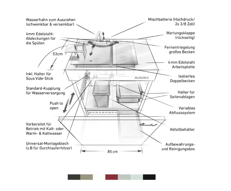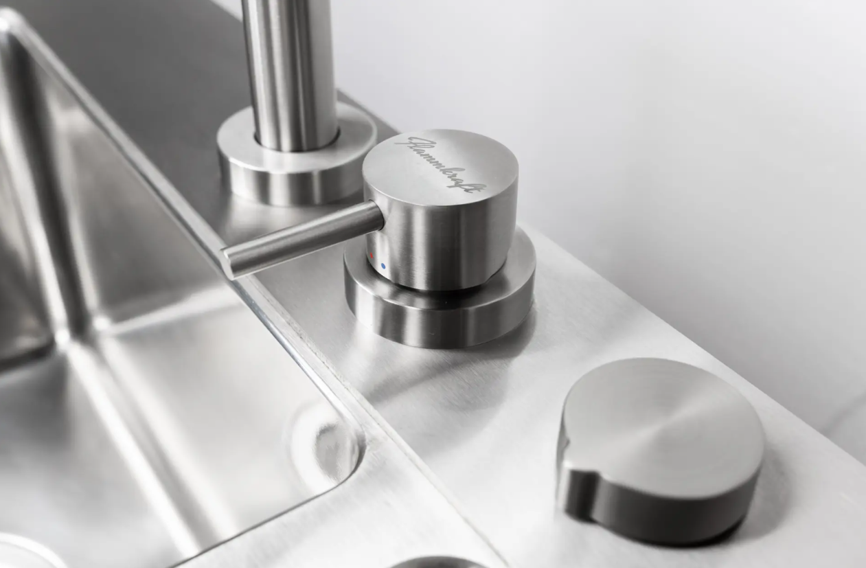 Ausgestattet mit einem isolierten Doppelwaschbecken und einem schwenkbaren sowie versenkbaren Wasserhahn mit ausziehbaren Kopf. So ermöglicht der Block L das direkte Waschen und Verarbeiten von Lebensmitteln oder Händewaschen im Außenbereich. Unnötige Wege ins Haus werden so eingespart. Der mitgelieferte Edelstahl-Halter für Sous-Vide-Sticks erweitert die Möglichkeiten zusätzlich.